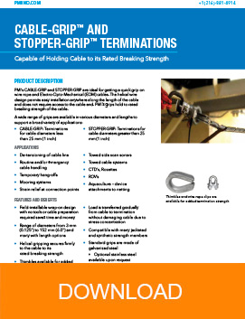 CABLE-GRIP terminations are for cable diameters less than 1.0” and STOPPER-GRIP terminations are for cable diameters 1.0” and over. PMI grips are fully capable of holding your cable to the rated breaking strength. The helical wire design permits easy installation anywhere along the length of the cable and does not require access to the cable end. The complete cable passes through the termination intact. Tensile load transfers gradually from cable to termination with no stress concentration to damage your cable.
